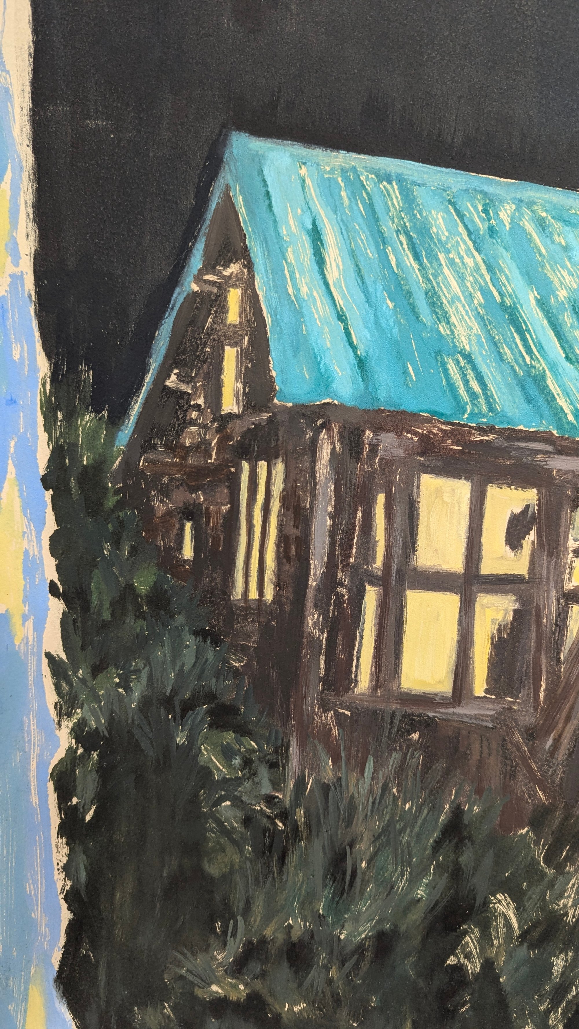 This piece depicts a derelict house in rural Ireland, dimly lit from within—a symbol of absence, memory, and resilience. It began with my personal longing for homeownership, for a place to call my own—something becoming more and more out of reach for people in Ireland.